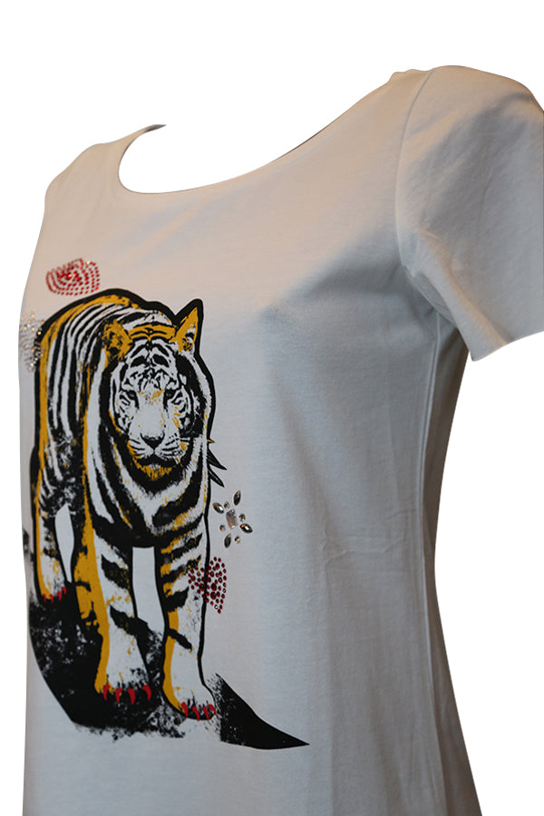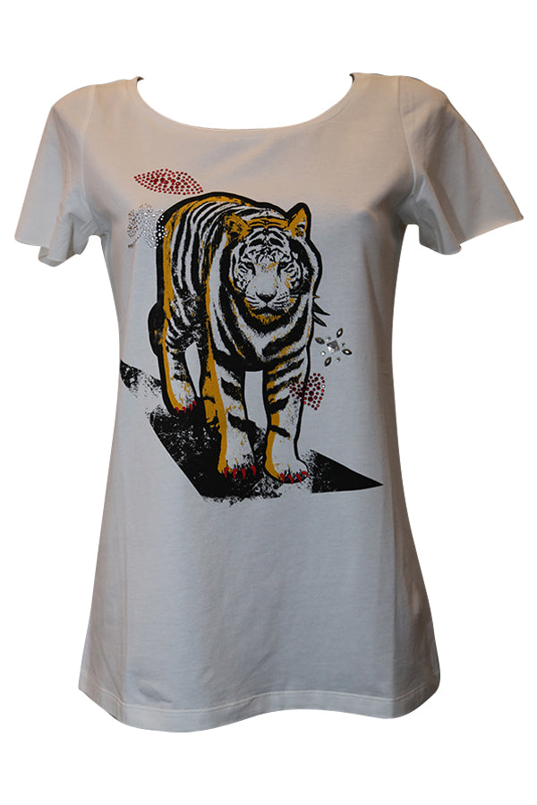 En jersey coton et élasthane blanc le T Shirt Liu Jo C15150 nous propose un imprimé de félin " TIGRE ".