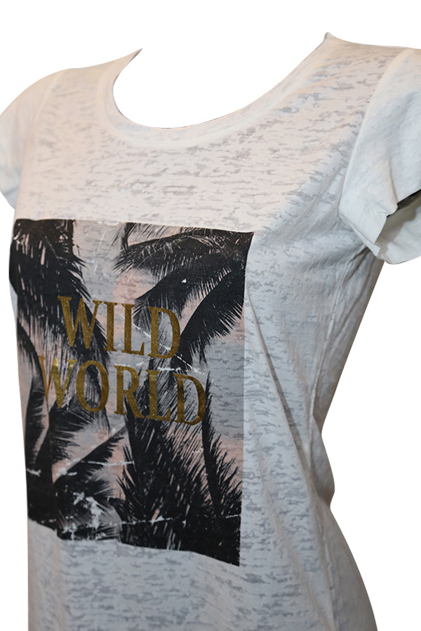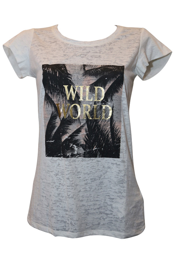 Un jersey mélange blanc à motifs ajourés sur le T Shirt Liu Jo F15028, sur l'avant un imprimé d'inscriptions doré WILD WORLD, qui vous emmène tout droit sur une île encore sauvage.