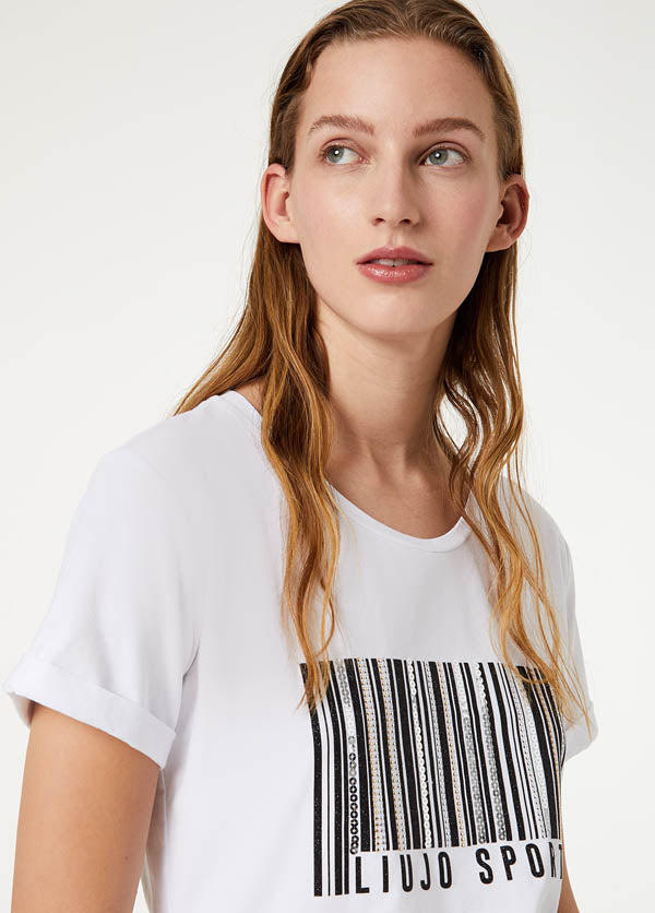Avec son imprimé code barre orné de clous, de strass et de sequins, Liu Jo signe une ligne sport'glam avec son t-shirt à manches courtes avec revers et son col rond.