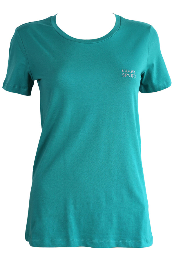T Shirt en jersey coton et élasthane vert de la ligne LIU JO SPORT avec inscriptions en strass sur la poitrine.
