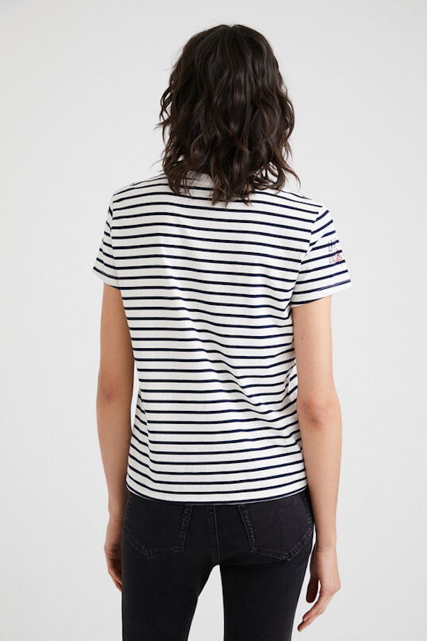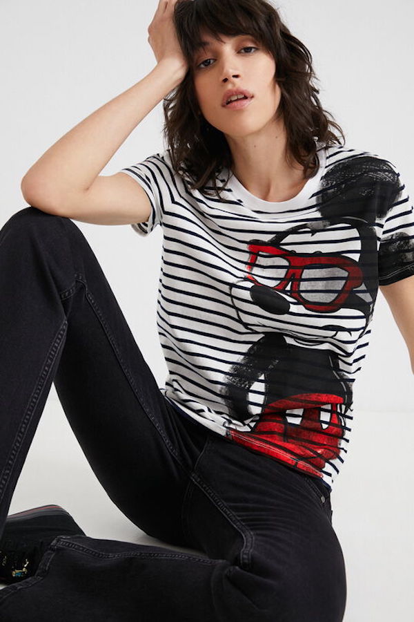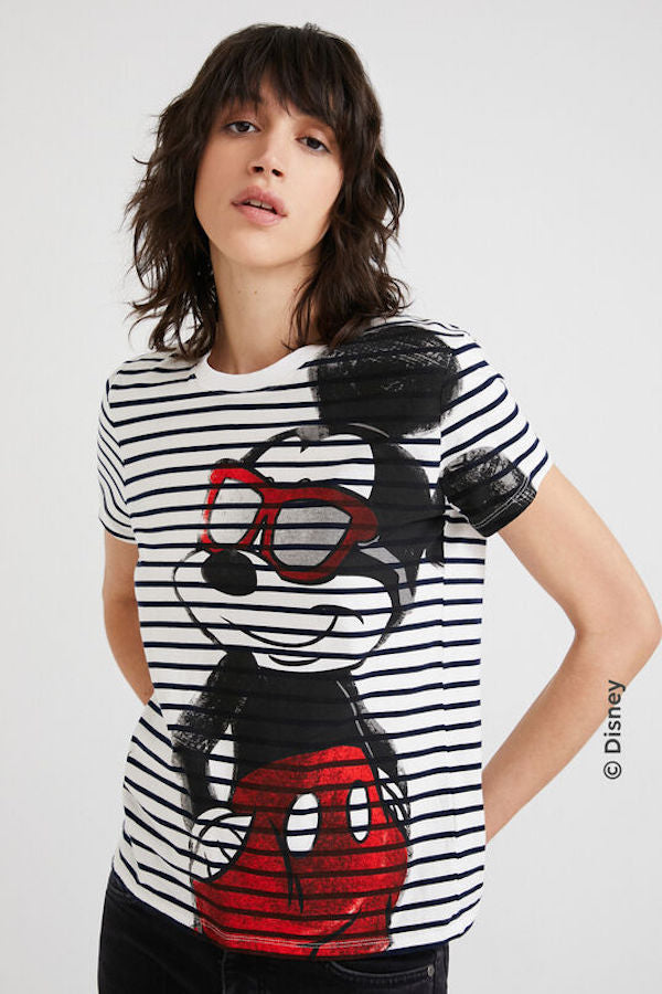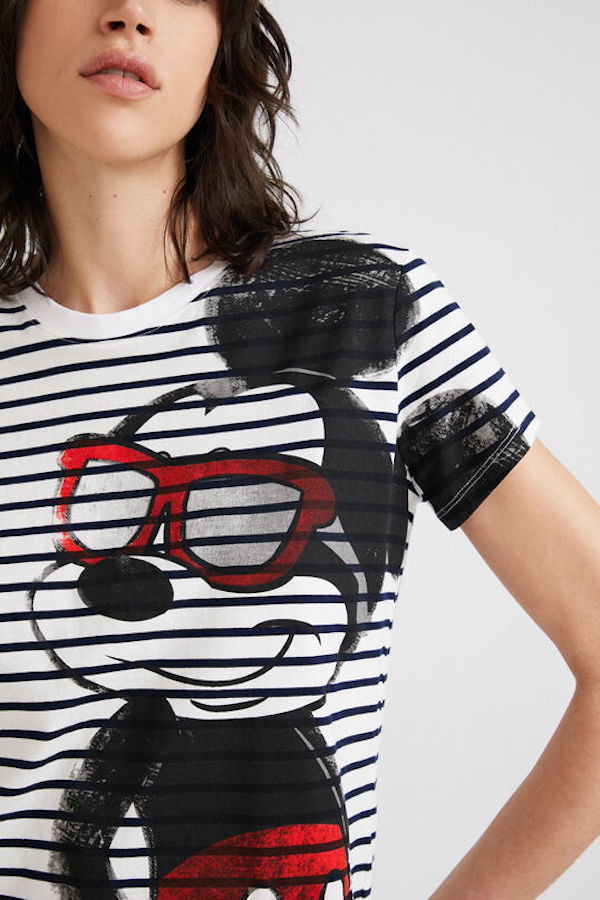 En coton blanc rayé noir, Desigual vous propose sont t-shirt imprimé de l'icône de notre jeunesse Mickey Mouse.