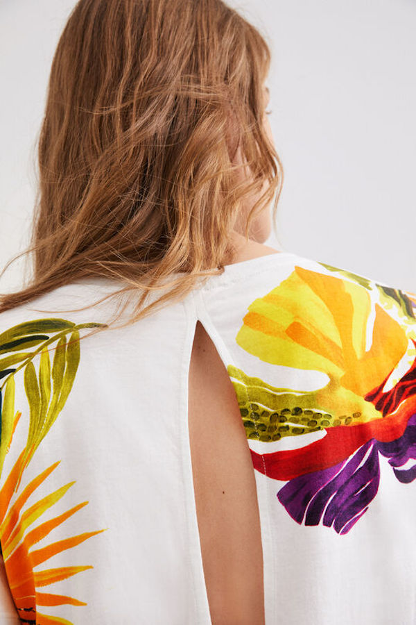 Avec son décolleté original dans le dos, le t-shirt Desigual est en coton blanc avec un imprimé tropical.