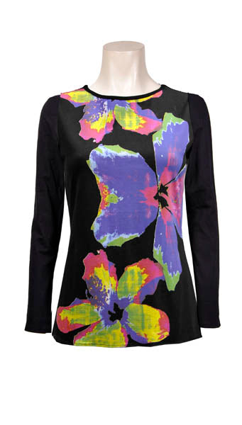 T Shirt Savage Culture en jersey noir avec imprimé floral couleurs arc en ciel sur l'avant, l'arrière est uni noir.