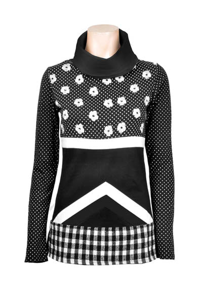 T Shirt Savage Cullture à manches longues et col roulé en jersey coton et élasthane noir avec imprimé de petits points blanc et broderies de fleurs blanches.
