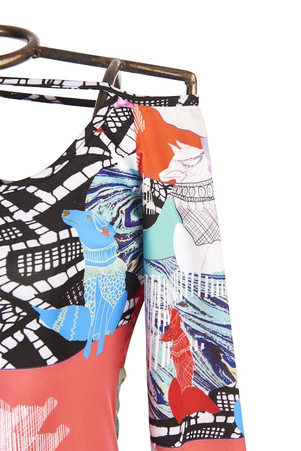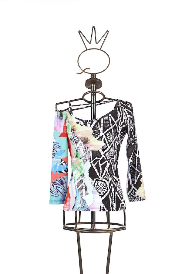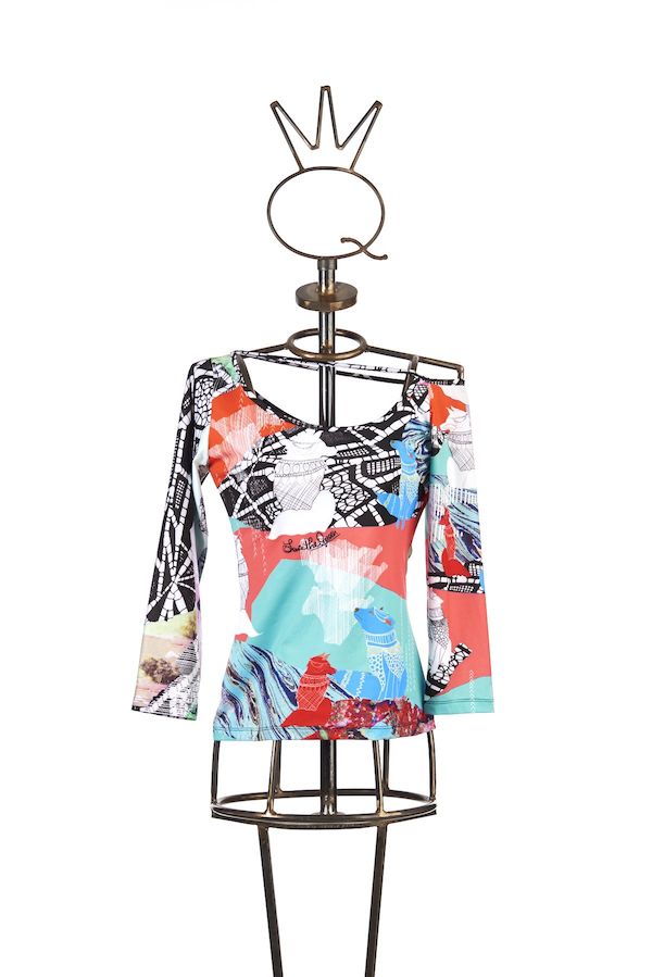 Tel un tableau, Save the Queen met en scène, aux courbes abstraites et colorées, des loups dans un paysage! Il possède un col rond et des manches 3/4.