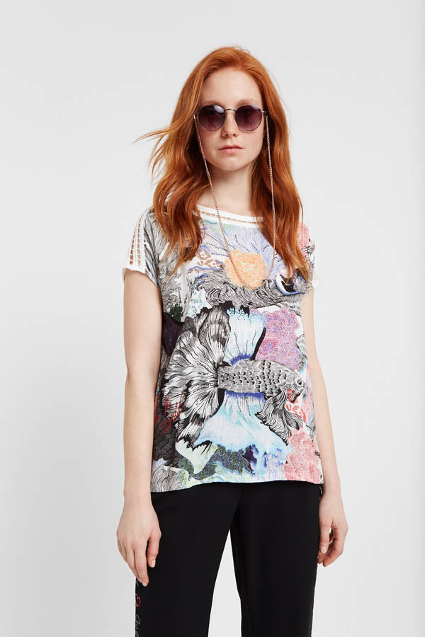 Avec ses imprimés japonais, le t-shirt Desigual nous offre des manches courtes et d'un col rond rehaussés d'insert en crochet.