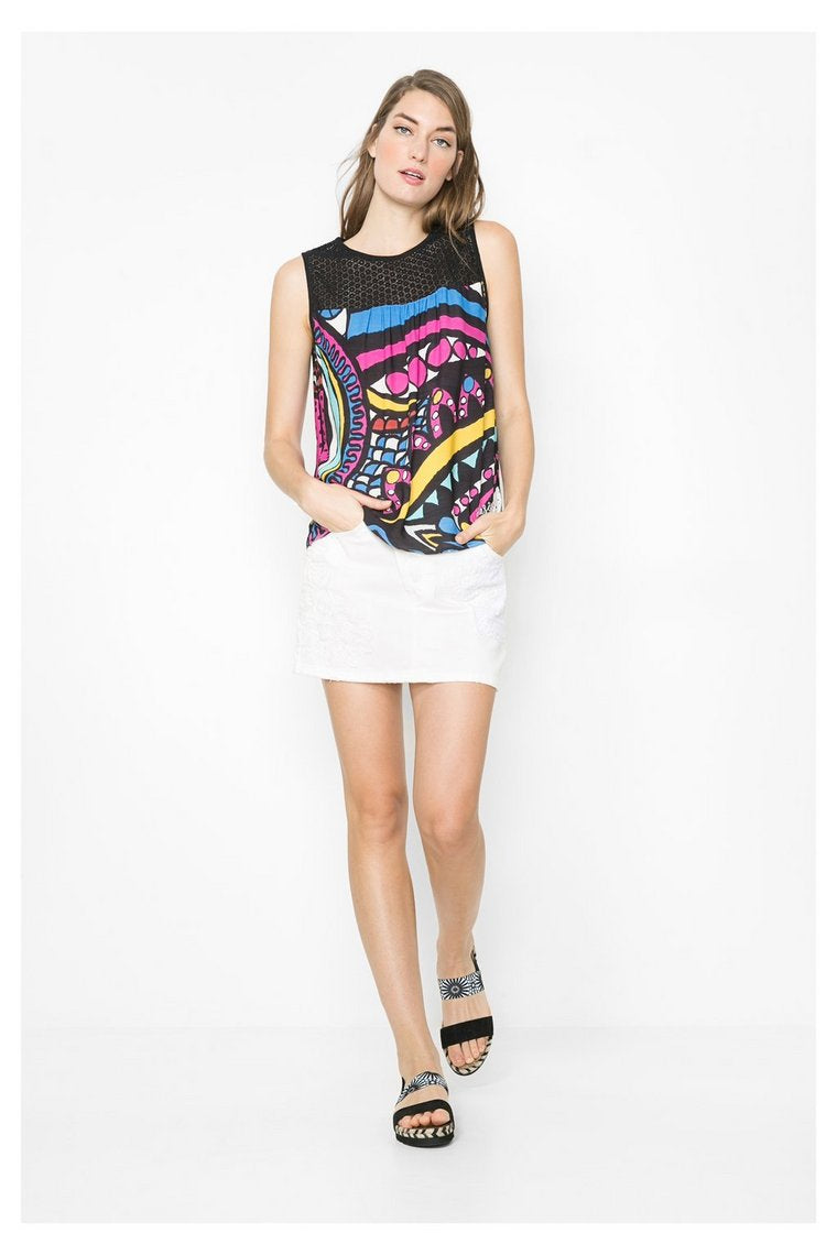 Le top Desigual Coraline 61B23J5 est sans manches, il nous propose une coupe ample avec fronces à l'avant, sur les cotés et au dos des ganses de broderies noir ajourées.