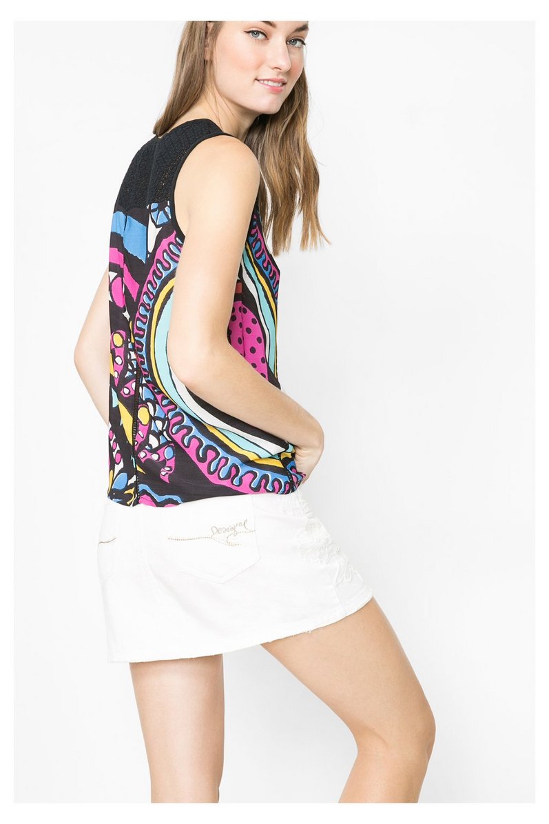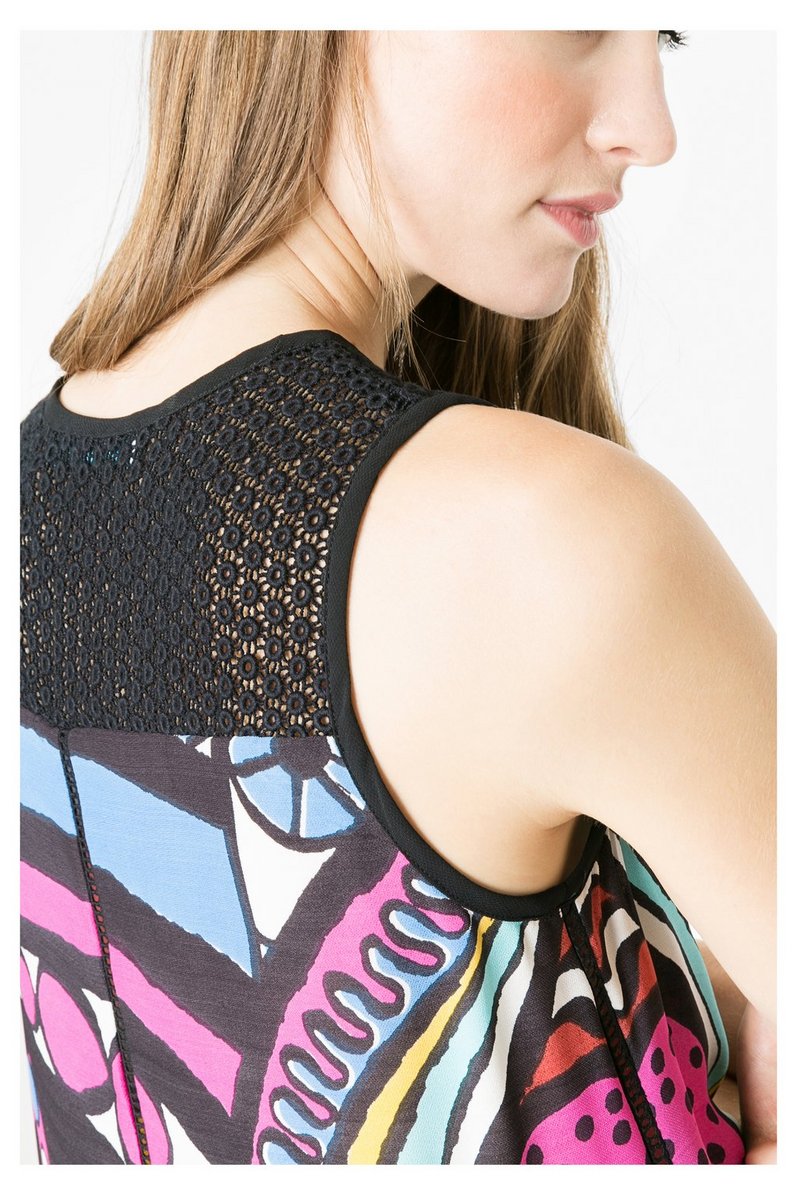 En jersey viscose noir fluide imprimé de motifs psychédéliques très colorés et un empiècement de résille noir aspect broderies fait de petits cercles sur le haut du Top Desigual.