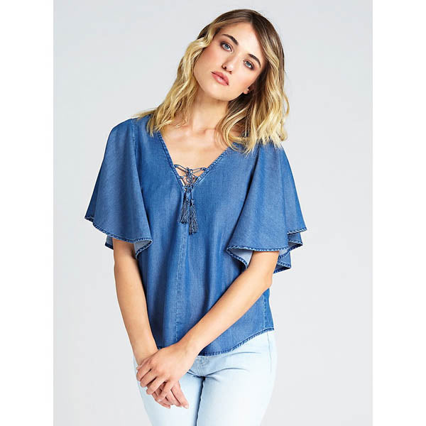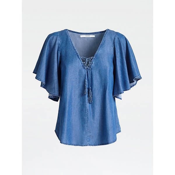 Le top Guess possède des manches chauve-souris, un décolleté profond avec un laçage corset et une base arrondie.