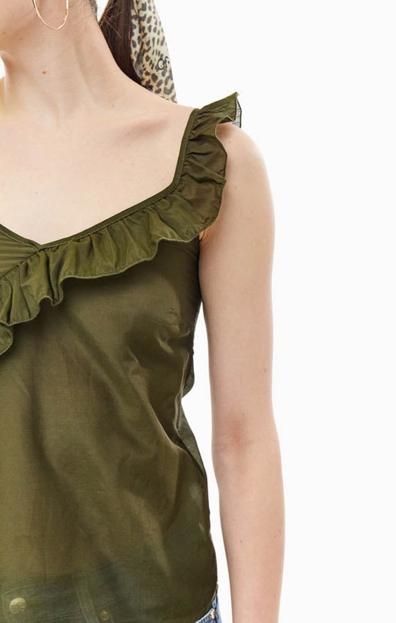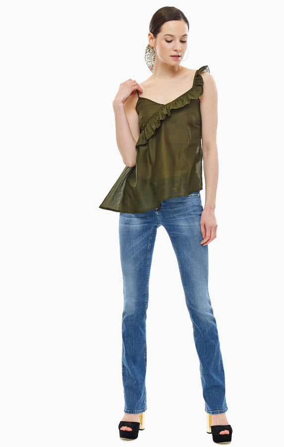 Avec ses fines bretelles, son décolleté en V croisé par une fronce, et une base asymétrique, le top Liu Jo se portera aussi bien sur un jean que sur un short, un pantalon ou une jupe.