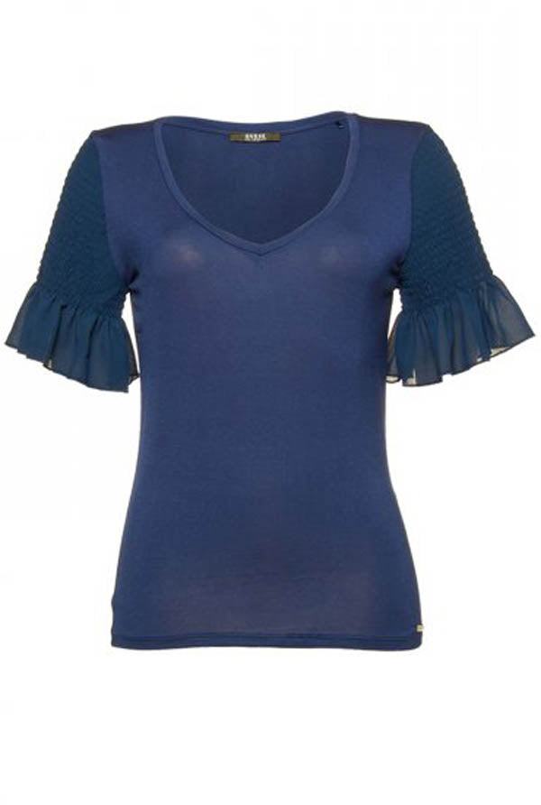 Avec ses manches courtes smockées avec volants, le top Guess est élégant et possède un col en V.