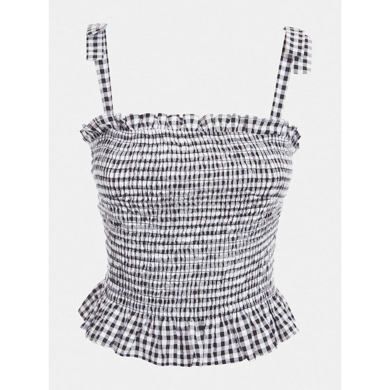 Avec son imprimé vichy noir et blanc, le top signé Guess est muni de bretelles ajustables et rehaussées d'un noeud, d'un col carré et d'une base froncés.