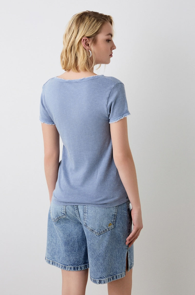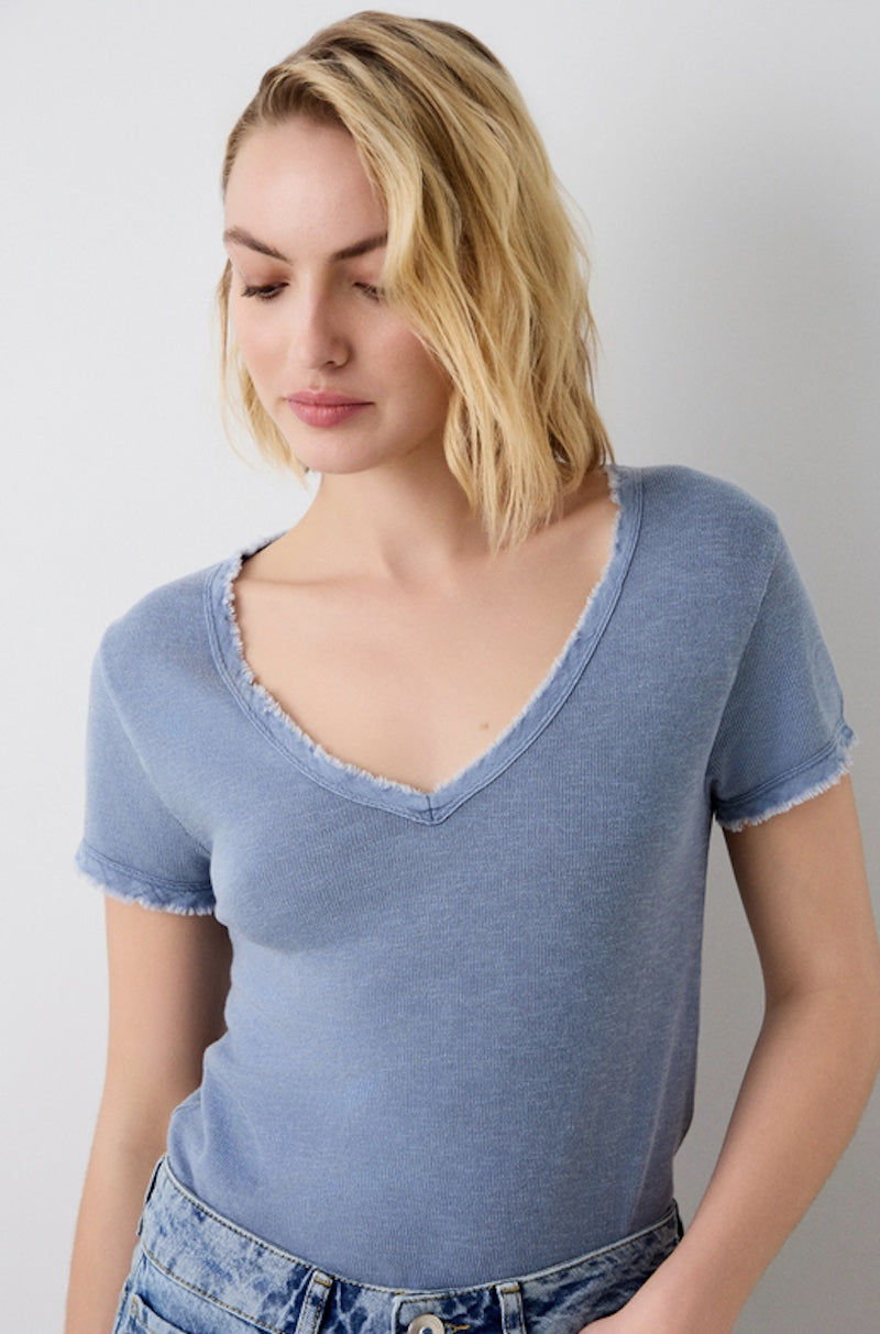 Tshirt basic bleu col V bords frangés BSB fashion 053-210128 BLEU