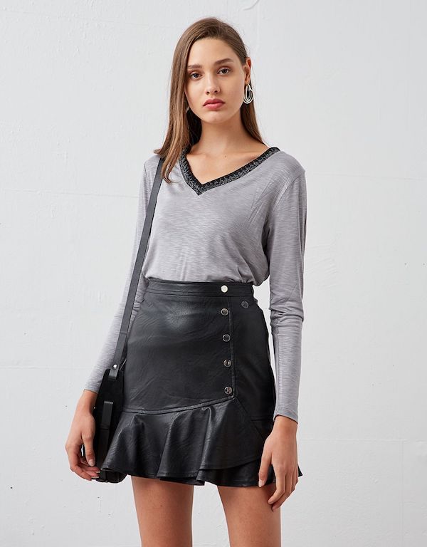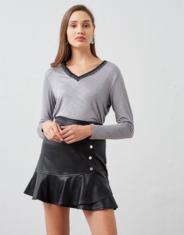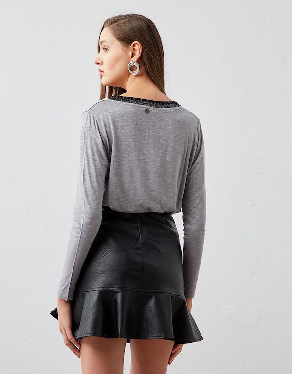 Tshirt fluide de la marque BSB à manches longues et col V rehaussé par un fil de lurex argenté.
