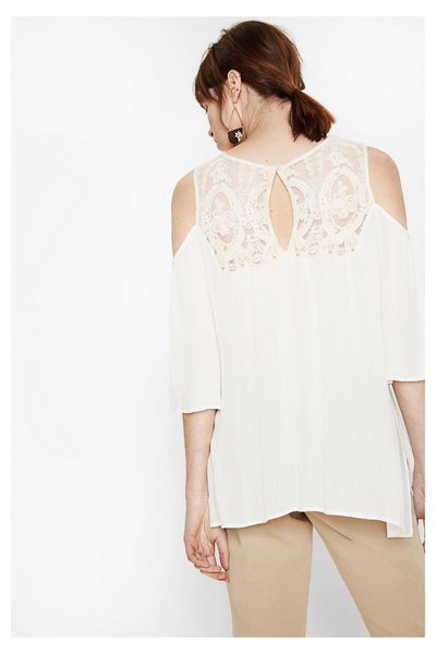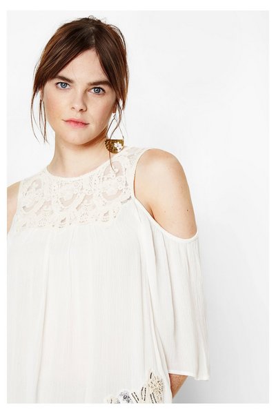 Tshirt long façon tunique Desigual 72B2YG8 modèle Murcia avec épaule ouvertes, dentelle sur le haut et belle broderie métalisée sur le bas.