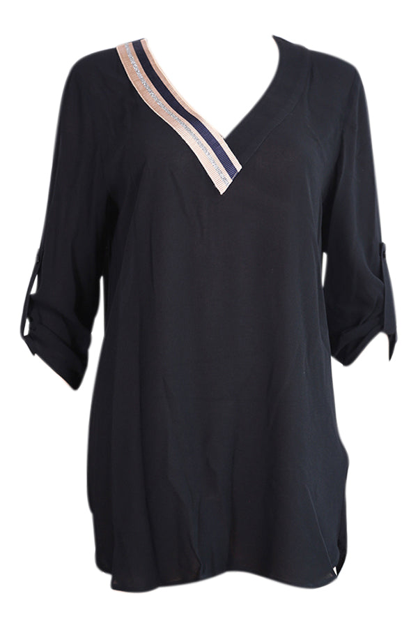 La tunique Liu Jo F16029T8374 nous propose un décolleté en V profond et sur un coté de l'encolure une large ganse dorée avec bandes pailleté métal et noir.