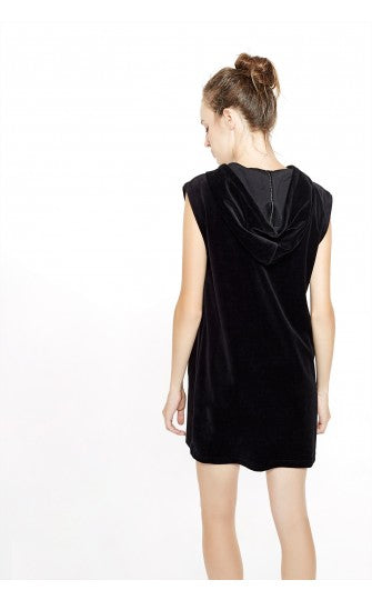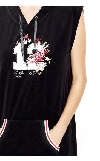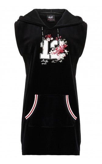 Tunique Liu Jo SPORT très douce en velours noir avec floquage blanc et rouge de numéros et fleurs, elle est sans manches, avec une capuche et lien de serrage.