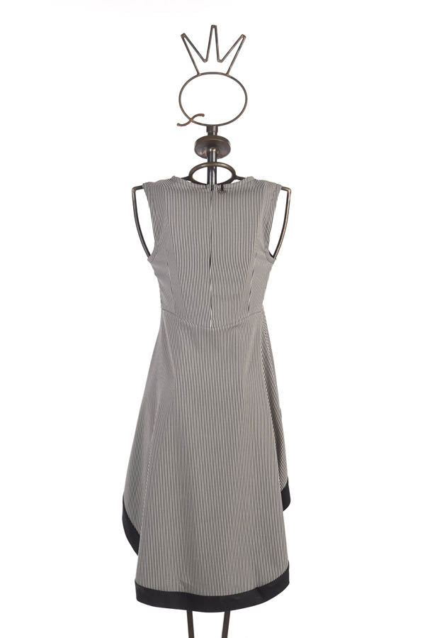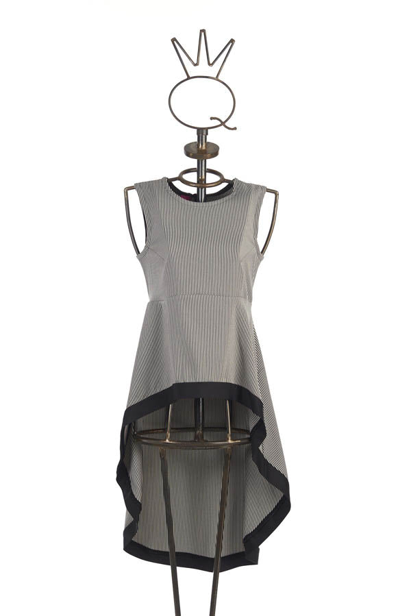 Avec ses rayures et sa base contrastante, la tunique Save the Queen est sans manches et possède un col rond et une base plus longue derrière que devant.