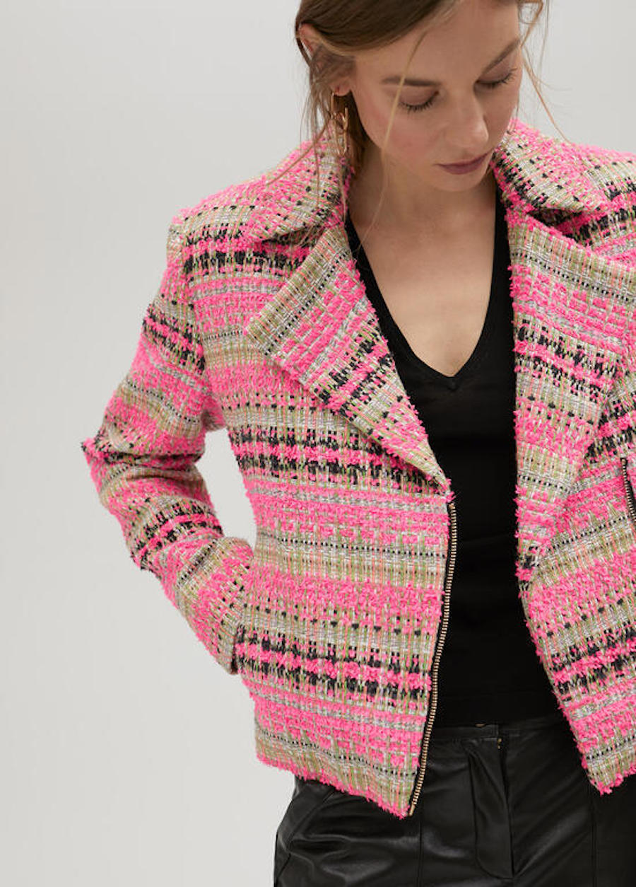 Une coupe motard et un tissus à la Chanel contrastant