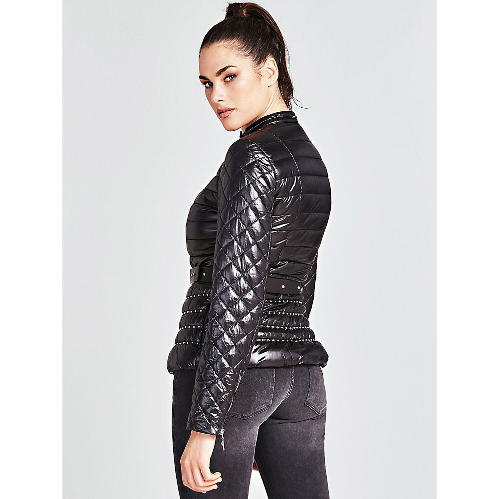 Guess présente la veste Kin avec des surpiqûres donnant un effet matelassé, un col mao boutonné, une fermeture zippée et une ceinture.
