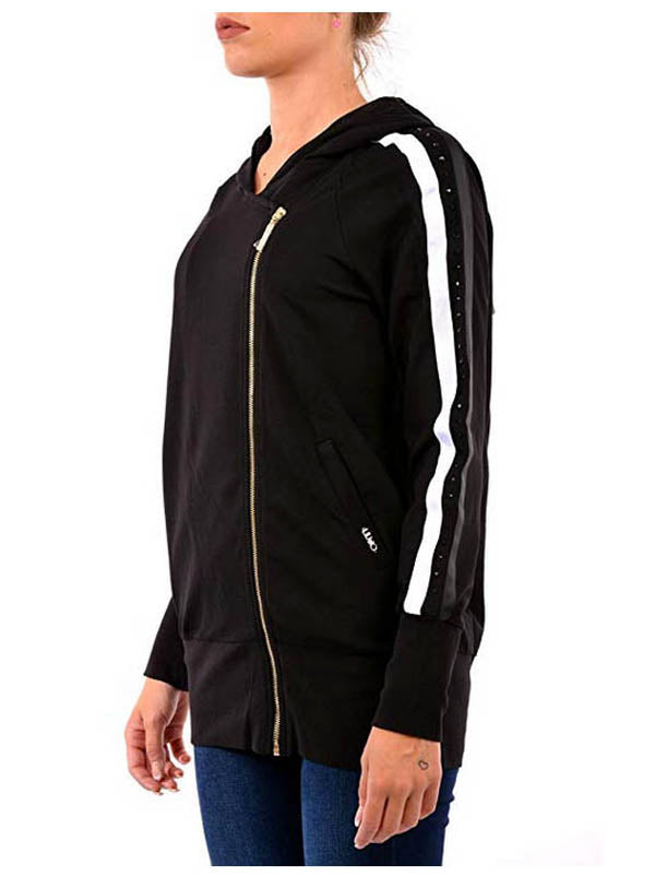 La veste signée Liu Jo sport possède une capuche, des manches longues ornées de strass et de bandes blanches, des finitions élastiques et une fermeture zippée biais.