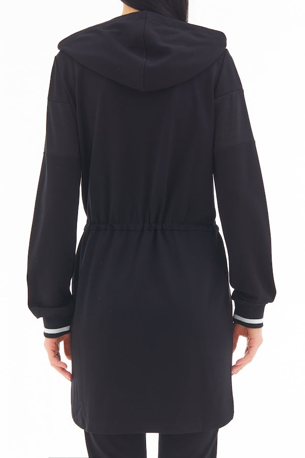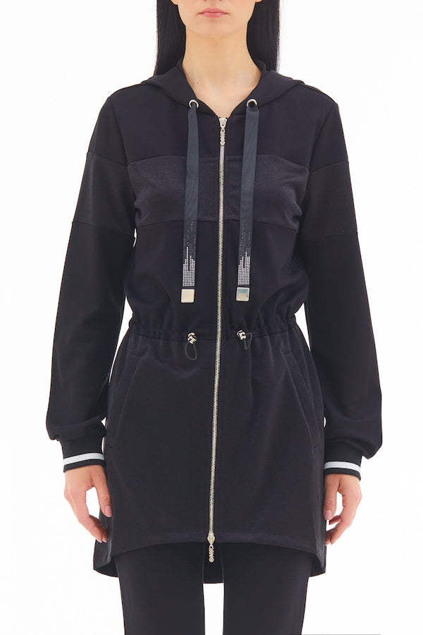 La veste longue Liu Jo est munie de manches longues, d'une capuche avec ruban de serrage, une bande ton sur ton, des poches et une taille avec cordon de serrage élastique.