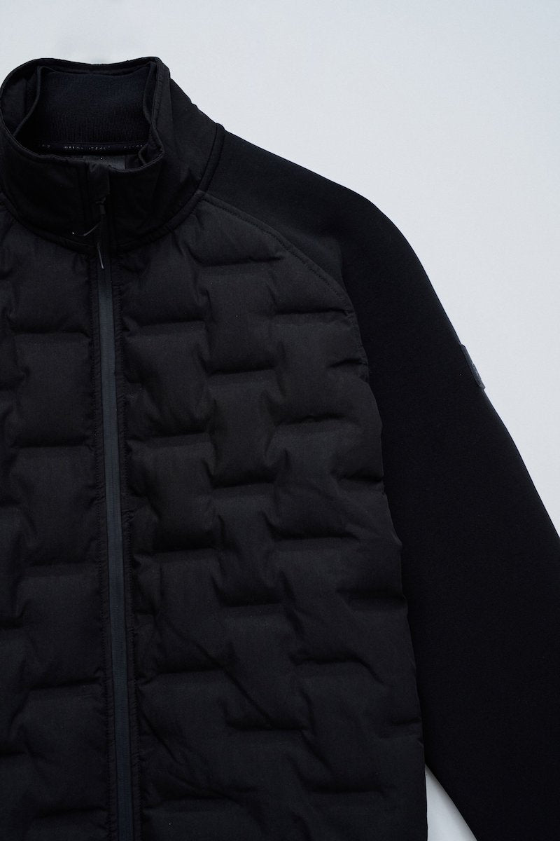 Blouson homme conçu dans plusieurs matériaux avec fermeture par zip.